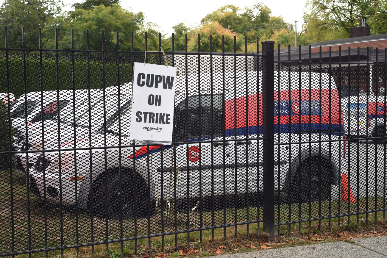 A strike sign hangs outside of a Canada Post location on Commercial Drive in Vancouver on September 26, 2025. Emma Arkell/PressProgress.